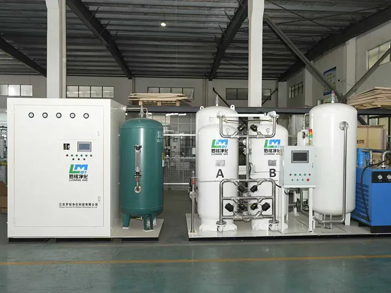 يدخل الهواء المضغوط النظيف إلى وحدة الامتزاز (PSA) في المرحلة الأولى. وتحت ضغط محكوم، يقوم المنخل الجزيئي بامتصاص النيتروجين وثاني أكسيد الكربون والغازات الخاملة النزرة تفضيلياً بناءً على الاختلافات الحركية للامتزاز. كما يمر الأكسجين عبر طبقة المادة الممتزة لتكوين أكسجين بنقاء 93%±2%. وتعمل وحدات الامتزاز بالتناوب بين خفض الضغط والتجديد، حيث تضمن دورات التبديل التي يتحكم فيها نظام (PLC) (حوالي 120 ثانية) تدفقاً مستمراً للأكسجين. - التنقية الثانوية بنظام (PSA) تحقق نقاء أكسجين يتجاوز 99.5 بالمائة