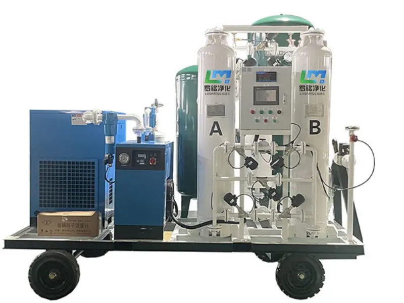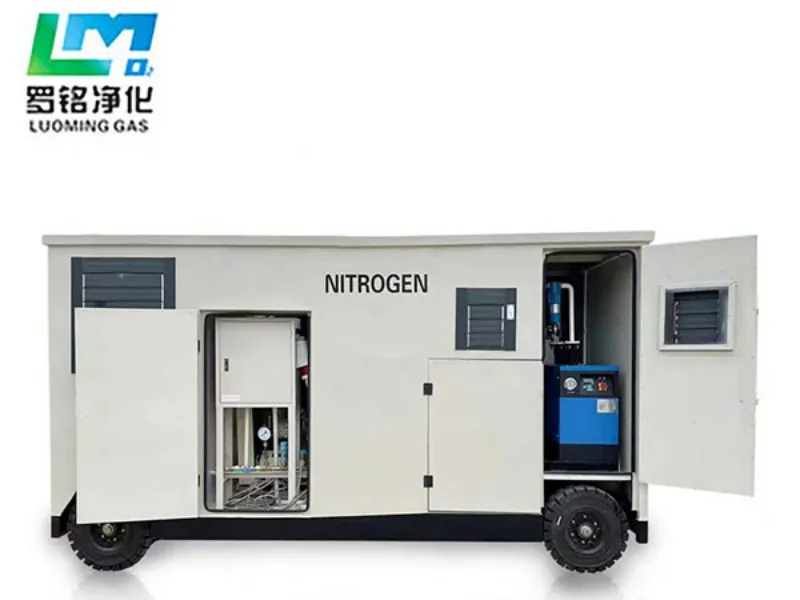 يعمل مولد النيتروجين المتنقل القائم على نظام المقطورة على إنتاج النيتروجين من خلال تقنية الامتزاز بتأرجح الضغط (PSA) باستخدام هواء مضغوط نظيف كغاز تغذية. كما يتم فصل النيتروجين عن الأكسجين بواسطة امتزاز المنخل الجزيئي، بينما يوفر هيكل المقطورة ميزة التنقل والحركة دون تغيير المبدأ الأساسي لتوليد النيتروجين.